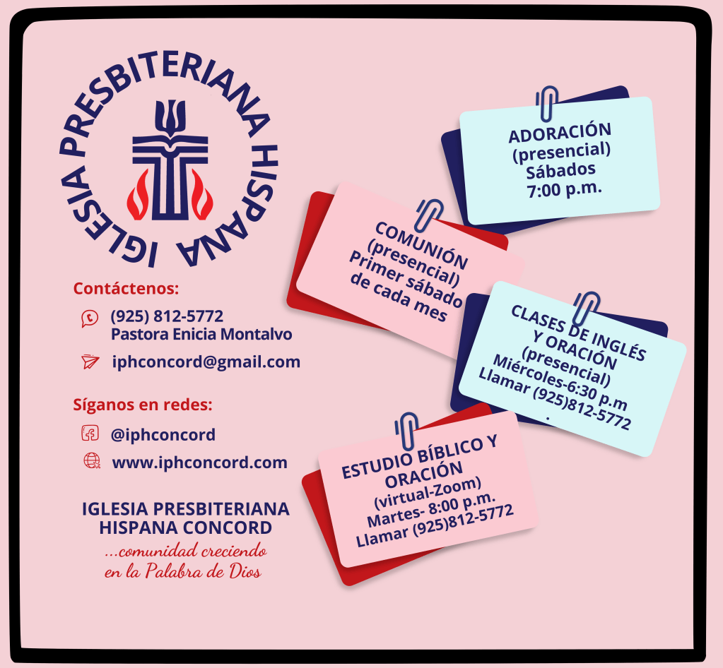 La Iglesia Presbiteriana Hispana en Concord está adscrita al Presbiterio de San Francisco. Nos ubicamos en la ciudad de Concord, California. Buscamos una profunda integración con nuestra comunidad a través de diversas actividades, siendo la primera y más importante, la difusión de la Palabra de Dios.